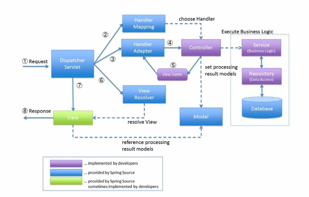 - (์์ฒญ → DispatcherServlet → HandlerMapping → Controller → ModelAndView → ViewResolver → View)